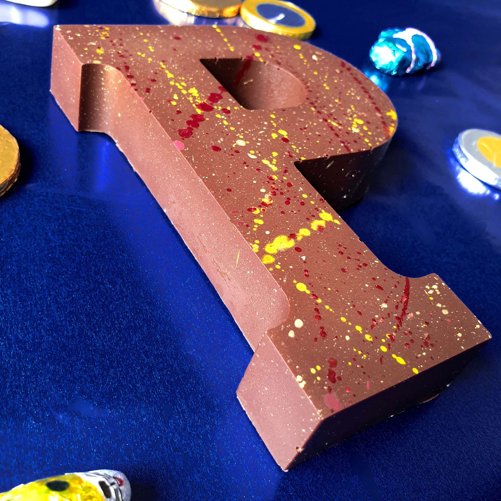 De chocoladeletter is omhuld met melk, witte of pure Callebaut chocolade naar keuze en heeft een vulling van witte chocolade crispy pearls, gezouten karamel, een witte chocolade vanille ganache en een cookies & cream ganache.